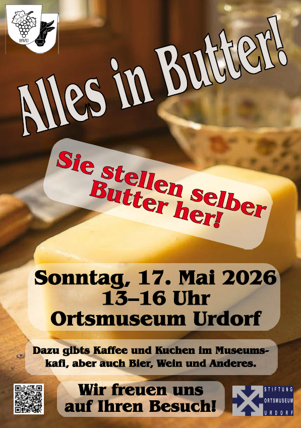 Im Zyklus "Urdorf hat landwirtschaftliche Wurzeln" demonstriert das Ortsmuseum in diesem Jahr, wie die von den Bauern erzeugten Produkte früher verarbeitet wurden. Am heutigen Sonntag starten wir mit der Herstellung von Butter: Welchen Rohstoff braucht es? Welche Geräte waren notwendig? Wie lange ist Butter haltbar? Woher stammt die Redensart "Alles in Butter"? Zahlen und Fakten zur Milchverarbeitung allgemein. Legen Sie selber Hand an!
